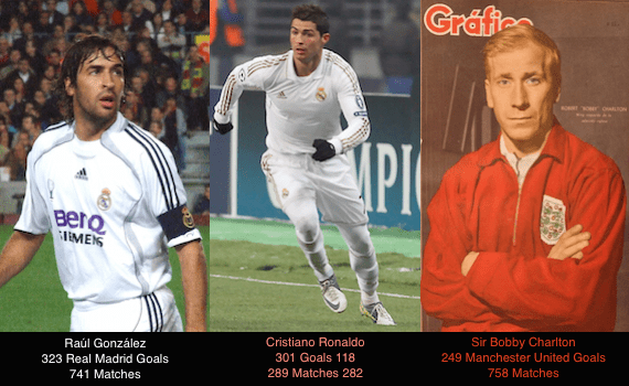 There’s a long way to go. As it stands, Cristiano’s record in Madrid includes 301 goals. He scored 118 at United. That leaves him behind Raúl (323 goals) at Madrid and Sir Bobby Charlton (249 goals) at Manchester United.